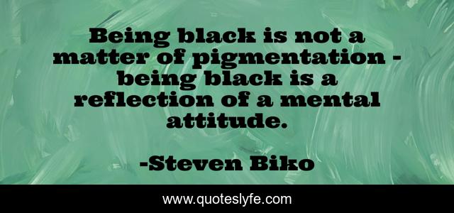 This page presents the quote "Being black is not a matter of pigmentation - being black is a reflection of a mental attitude.". Author of this quote is Steven Biko. This quote is about matter, black, reflection,.