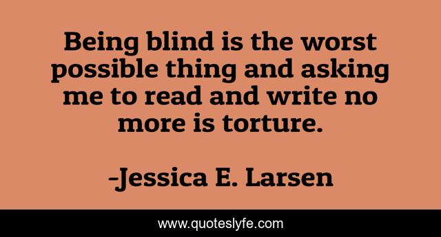 This page presents the quote "Being blind is the worst possible thing and asking me to read and write no more is torture.". Author of this quote is Jessica E. Larsen. This quote is about reading-books, reading, writing-books, writing-life,.