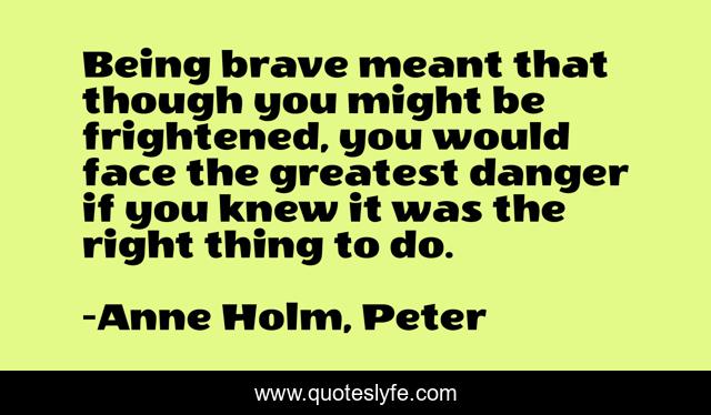 This page presents the quote "Being brave meant that though you might be frightened, you would face the greatest danger if you knew it was the right thing to do.". Author of this quote is Anne Holm, Peter. .