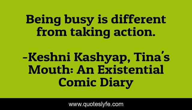 This page presents the quote "Being busy is different from taking action.". Author of this quote is Keshni Kashyap, Tina's Mouth: An Existential Comic Diary. This quote is about action, business,.