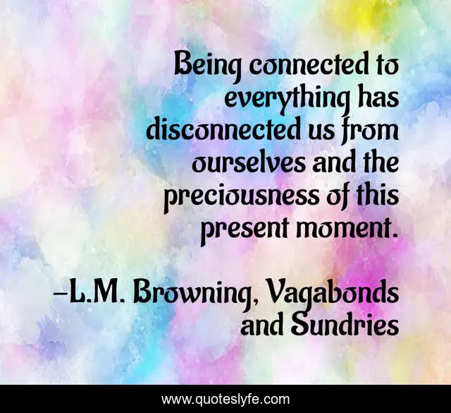 This page presents the quote "Being connected to everything has disconnected us from ourselves and the preciousness of this present moment.". Author of this quote is L.M. Browning, Vagabonds and Sundries. This quote is about disconnection, isolation, unplugged, unplugging, mindfulness,.