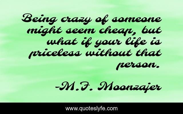 This page presents the quote "Being crazy of someone might seem cheap, but what if your life is priceless without that person.". Author of this quote is M.F. Moonzajer. This quote is about priceless, crazy, cheap,.