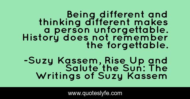 This page presents the quote "Being different and thinking different makes a person unforgettable. History does not remember the forgettable.". Author of this quote is Suzy Kassem, Rise Up and Salute the Sun: The Writings of Suzy Kassem. This quote is about individuality, human, being, society, being-different, unforgettable, thinking, think-different, originality,.