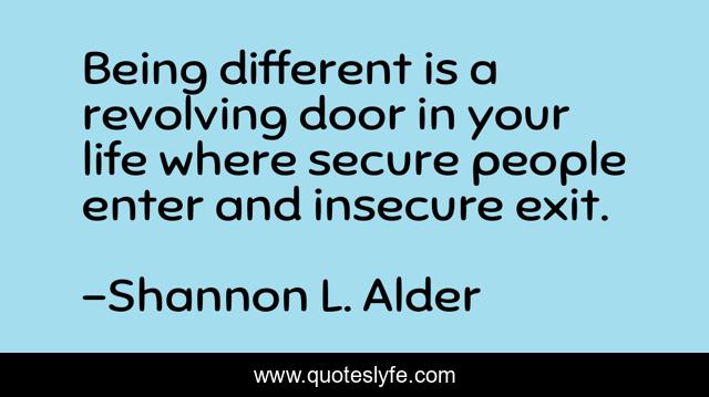 This page presents the quote "Being different is a revolving door in your life where secure people enter and insecure exit.". Author of this quote is Shannon L. Alder. This quote is about attitude, integrity, special, self-love, difference, beginnings, quality, letting-go, insecurity,.