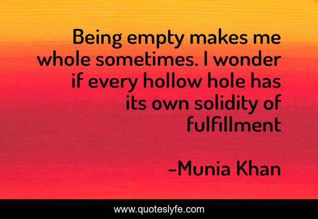 This page presents the quote "Being empty makes me whole sometimes. I wonder if every hollow hole has its own solidity of fulfillment". Author of this quote is Munia Khan. This quote is about emptiness-in-heart, myself, sometimes, solid, make, solidity, spiritual, hollow, fulfillment,.
