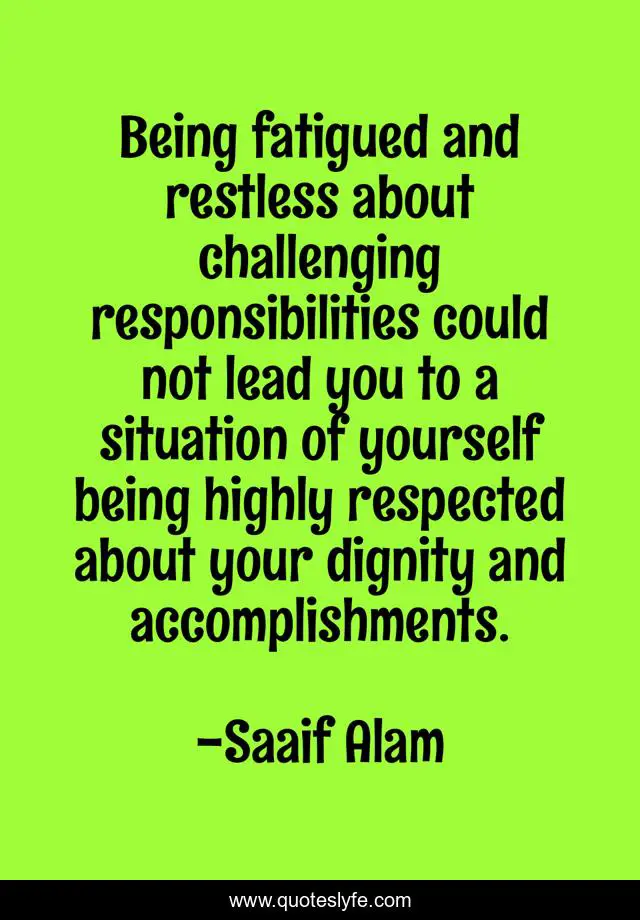 This page presents the quote "Being fatigued and restless about challenging responsibilities could not lead you to a situation of yourself being highly respected about your dignity and accomplishments.". Author of this quote is Saaif Alam. This quote is about enthusiasm, education, inspirational, stress-managagement,.