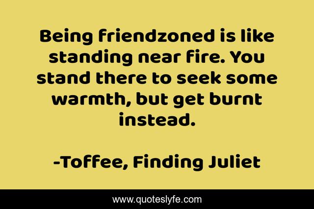 This page presents the quote "Being friendzoned is like standing near fire. You stand there to seek some warmth, but get burnt instead.". Author of this quote is Toffee, Finding Juliet. This quote is about relationships, love, relationship, romance, boys, friendship-and-love, girls-and-boys, friendship, affection,.