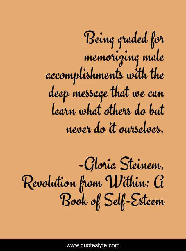 "Gloria Steinem, Revolution from Within: A Book of Self-Esteem Quotes." Quoteslyfe.com, 2025. Fri. 05 Dec. 2025. <https://www.quoteslyfe.com/quote/Being-graded-for-memorizing-male-accomplishments-with-34019>.