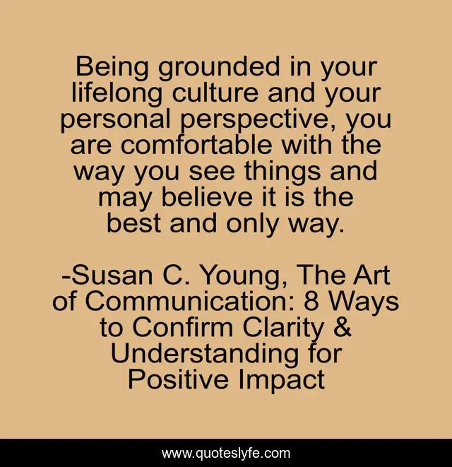 "Susan C. Young, The Art of Communication: 8 Ways to Confirm Clarity & Understanding for Positive Impact Quotes." Quoteslyfe.com, 2025. Mon. 08 Dec. 2025. <https://www.quoteslyfe.com/quote/Being-grounded-in-your-lifelong-culture-and-233432>.