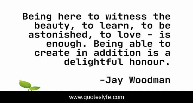This page presents the quote "Being here to witness the beauty, to learn, to be astonished, to love - is enough. Being able to create in addition is a delightful honour.". Author of this quote is Jay Woodman. This quote is about love, beauty, create, delight, witness, learn, affection,.