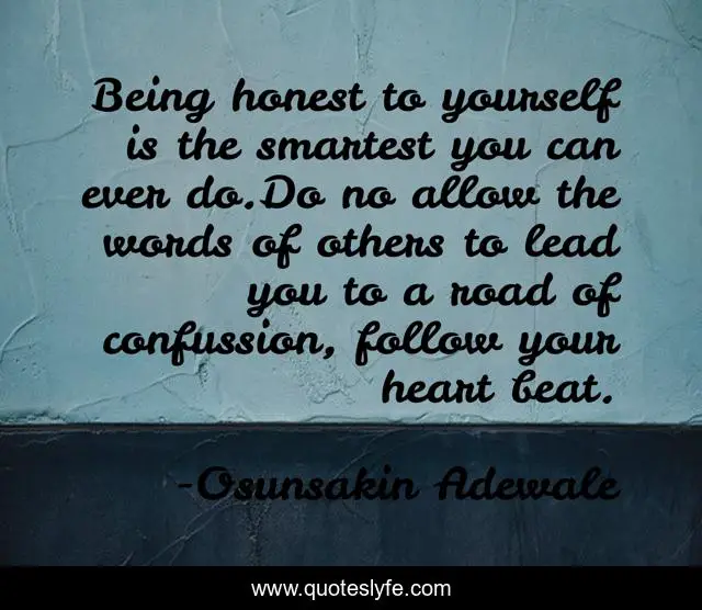 This page presents the quote "Being honest to yourself is the smartest you can ever do.Do no allow the words of others to lead you to a road of confussion, follow your heart beat.". Author of this quote is Osunsakin Adewale. .