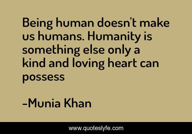 This page presents the quote "Being human doesn't make us humans. Humanity is something else only a kind and loving heart can possess". Author of this quote is Munia Khan. This quote is about heart, kind, human-nature, humans, wise-words, being-human, loving, human, hearts,.