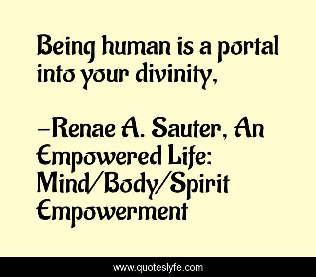 This page presents the quote "Being human is a portal into your divinity, ". Author of this quote is Renae A. Sauter, An Empowered Life: Mind/Body/Spirit Empowerment. This quote is about empowerment, personal-growth, spiritual, self-development, spirituality, mental-health, self-help, holistic-health,.
