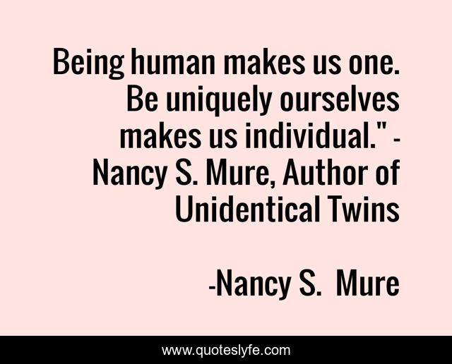 This page presents the quote "Being human makes us one. Be uniquely ourselves makes us individual." - Nancy S. Mure, Author of Unidentical Twins". Author of this quote is Nancy S. Mure. This quote is about identical, individuality, appreciation, uniqueness, twins, self-esteem,.
