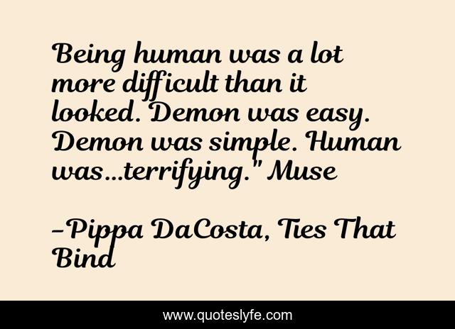 This page presents the quote "Being human was a lot more difficult than it looked. Demon was easy. Demon was simple. Human was…terrifying." Muse". Author of this quote is Pippa DaCosta, Ties That Bind. This quote is about the-veil-series, pippa-dacosta, akil-vitalis, demons, muse, urban-fantasy-series,.