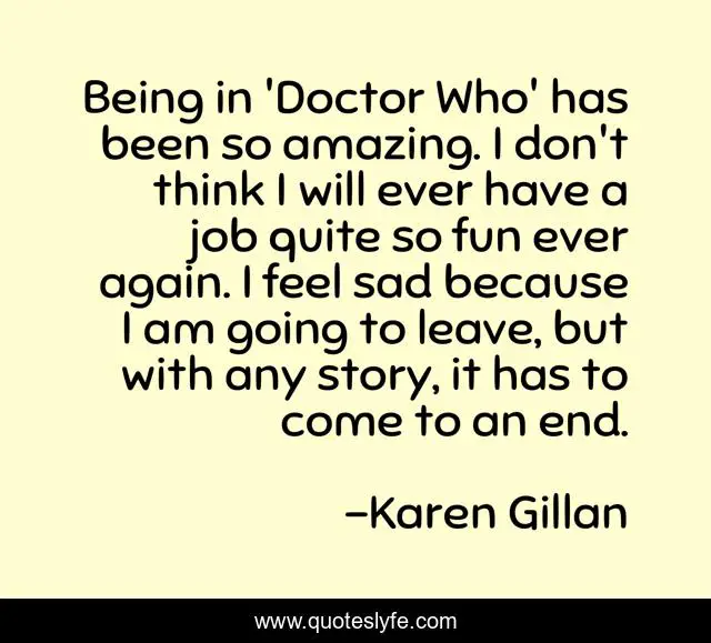 This page presents the quote "Being in 'Doctor Who' has been so amazing. I don't think I will ever have a job quite so fun ever again. I feel sad because I am going to leave, but with any story, it has to come to an end.". Author of this quote is Karen Gillan. This quote is about job, sad,.