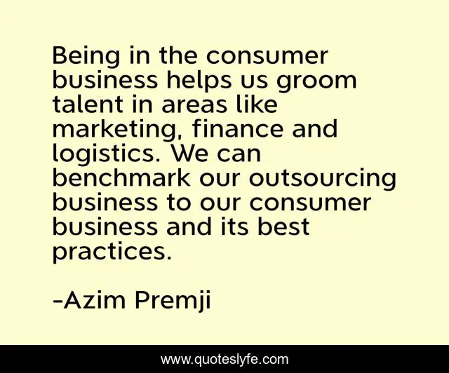This page presents the quote "Being in the consumer business helps us groom talent in areas like marketing, finance and logistics. We can benchmark our outsourcing business to our consumer business and its best practices.". Author of this quote is Azim Premji. This quote is about marketing, business, best,.