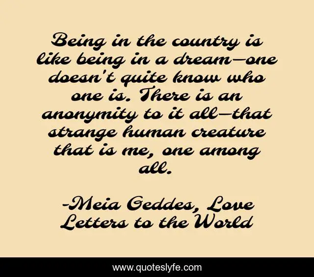 This page presents the quote "Being in the country is like being in a dream—one doesn't quite know who one is. There is an anonymity to it all—that strange human creature that is me, one among all.". Author of this quote is Meia Geddes, Love Letters to the World. This quote is about countryside, country, country-life,.