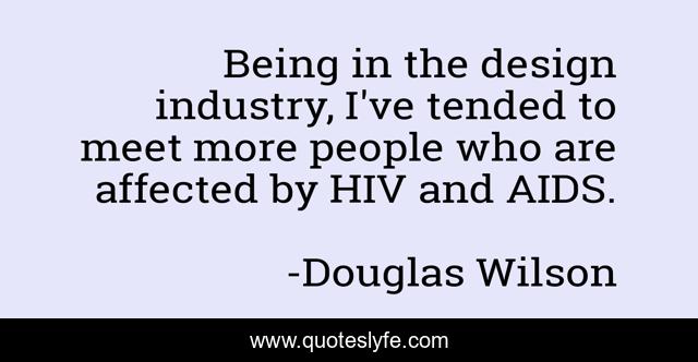 This page presents the quote "Being in the design industry, I've tended to meet more people who are affected by HIV and AIDS.". Author of this quote is Douglas Wilson. This quote is about being, meet, people,.
