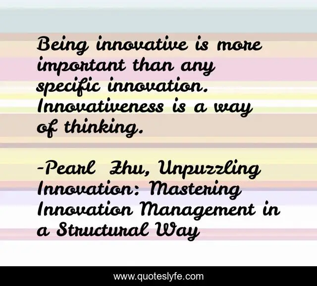 This page presents the quote "Being innovative is more important than any specific innovation. Innovativeness is a way of thinking.". Author of this quote is Pearl Zhu, Unpuzzling Innovation: Mastering Innovation Management in a Structural Way. This quote is about creativity, innovation,.