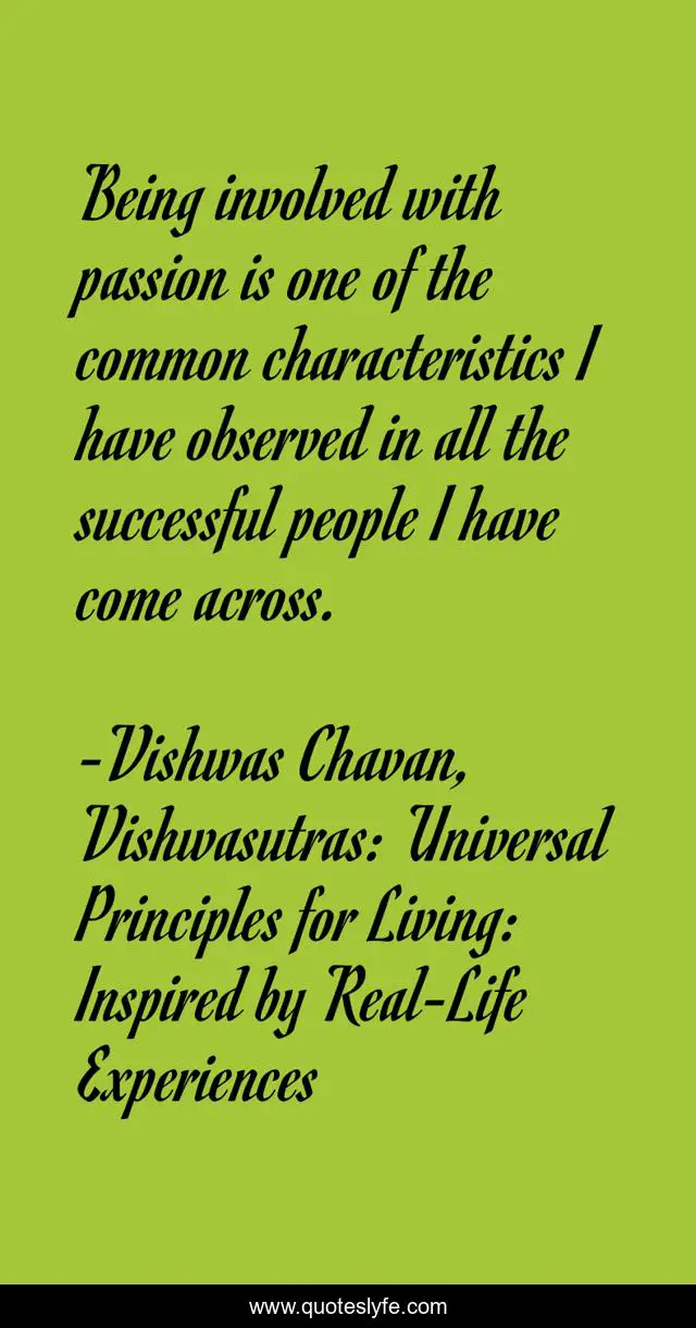 This page presents the quote "Being involved with passion is one of the common characteristics I have observed in all the successful people I have come across.". Author of this quote is Vishwas Chavan, Vishwasutras: Universal Principles for Living: Inspired by Real-Life Experiences. This quote is about passionate-living, passionate, passion, inspiration, self-help,.