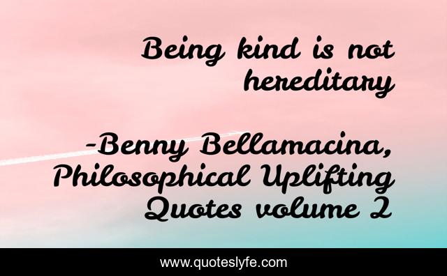 This page presents the quote "Being kind is not hereditary". Author of this quote is Benny Bellamacina, Philosophical Uplifting Quotes volume 2. This quote is about life, peace, love, philosophy, wisdom, kindness, affection,.