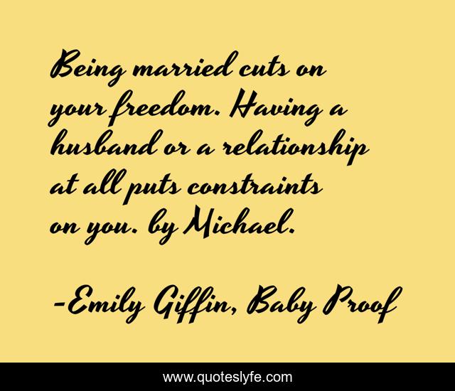 This page presents the quote "Being married cuts on your freedom. Having a husband or a relationship at all puts constraints on you. by Michael.". Author of this quote is Emily Giffin, Baby Proof. This quote is about relationships, marriage, relationship,.