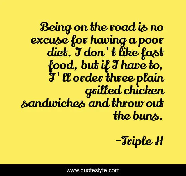 This page presents the quote "Being on the road is no excuse for having a poor diet. I don't like fast food, but if I have to, I'll order three plain grilled chicken sandwiches and throw out the buns.". Author of this quote is Triple H. This quote is about food, chicken, road,.