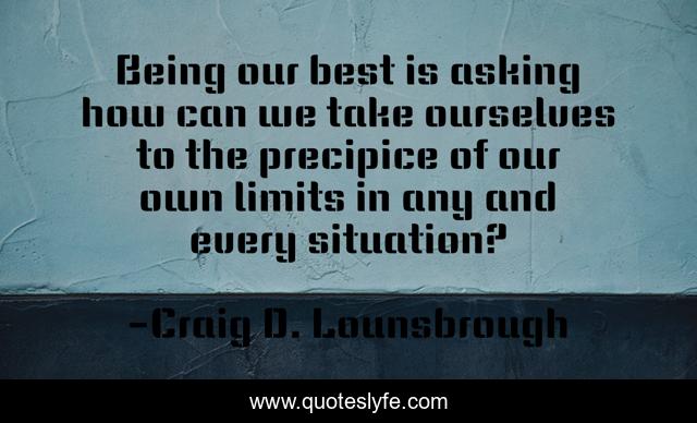 This page presents the quote "Being our best is asking how can we take ourselves to the precipice of our own limits in any and every situation?". Author of this quote is Craig D. Lounsbrough. This quote is about challenges, fortitude, mediocrity,.
