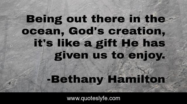 This page presents the quote "Being out there in the ocean, God's creation, it's like a gift He has given us to enjoy.". Author of this quote is Bethany Hamilton. This quote is about enjoy, gift, ocean,.