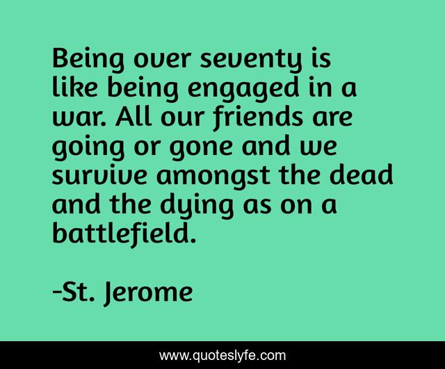 This page presents the quote "Being over seventy is like being engaged in a war. All our friends are going or gone and we survive amongst the dead and the dying as on a battlefield.". Author of this quote is St. Jerome. This quote is about survive, friends, seventy,.