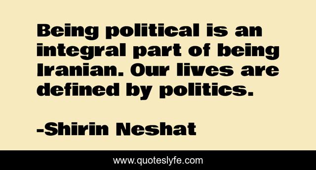 This page presents the quote "Being political is an integral part of being Iranian. Our lives are defined by politics.". Author of this quote is Shirin Neshat. This quote is about being, part, political,.