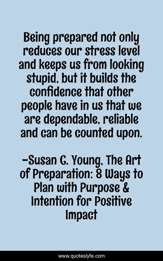 This page presents the quote "Being prepared not only reduces our stress level and keeps us from looking stupid, but it builds the confidence that other people have in us that we are dependable, reliable and can be counted upon.". Author of this quote is Susan C. Young, The Art of Preparation: 8 Ways to Plan with Purpose & Intention for Positive Impact. This quote is about preparation, success, relationship, communication-skills, attitude, behaviour, quotes-by-susan-c-young, susan-young, motivational-speaker,.