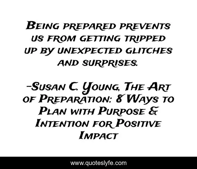 "Susan C. Young, The Art of Preparation: 8 Ways to Plan with Purpose & Intention for Positive Impact Quotes." Quoteslyfe.com, 2025. Fri. 05 Dec. 2025. <https://www.quoteslyfe.com/quote/Being-prepared-prevents-us-from-getting-tripped-227481>.