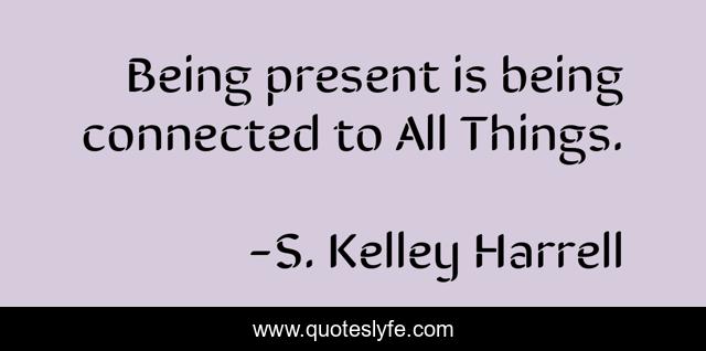 This page presents the quote "Being present is being connected to All Things.". Author of this quote is S. Kelley Harrell. This quote is about all-that-is, all-things, universal-connection, in-the-moment, shamanism, multiverse, present,.