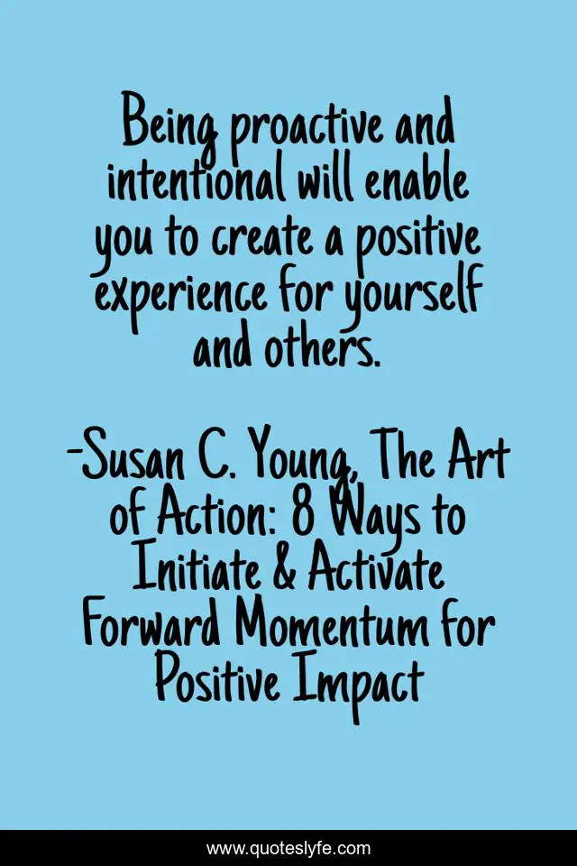 This page presents the quote "Being proactive and intentional will enable you to create a positive experience for yourself and others.". Author of this quote is Susan C. Young, The Art of Action: 8 Ways to Initiate & Activate Forward Momentum for Positive Impact. This quote is about build-momentum, relationship, communication-skills, emotional-intelligence, quotes-by-susan-c-young, susanspeaks-com, motivational-speaker-susan-young, customer-service,.