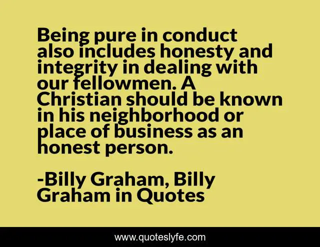 This page presents the quote "Being pure in conduct also includes honesty and integrity in dealing with our fellowmen. A Christian should be known in his neighborhood or place of business as an honest person.". Author of this quote is Billy Graham, Billy Graham in Quotes. This quote is about integrity, honesty, billy-graham,.