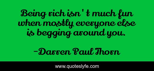 This page presents the quote "Being rich isn't much fun when mostly everyone else is begging around you.". Author of this quote is Darren Paul Thorn. .