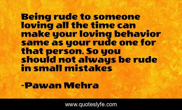 This page presents the quote "Being rude to someone loving all the time can make your loving behavior same as your rude one for that person. So you should not always be rude in small mistakes". Author of this quote is Pawan Mehra. This quote is about life, love, behavior, rude, mistakes, inspirational, anger, enthusiasm, affection,.