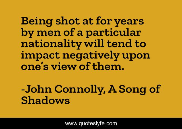 This page presents the quote "Being shot at for years by men of a particular nationality will tend to impact negatively upon one’s view of them.". Author of this quote is John Connolly, A Song of Shadows. This quote is about nationality, men,.