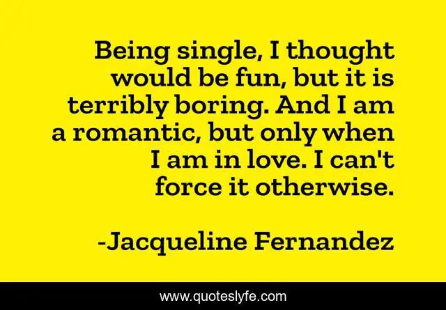 This page presents the quote "Being single, I thought would be fun, but it is terribly boring. And I am a romantic, but only when I am in love. I can't force it otherwise.". Author of this quote is Jacqueline Fernandez. This quote is about fun, love, affection,.