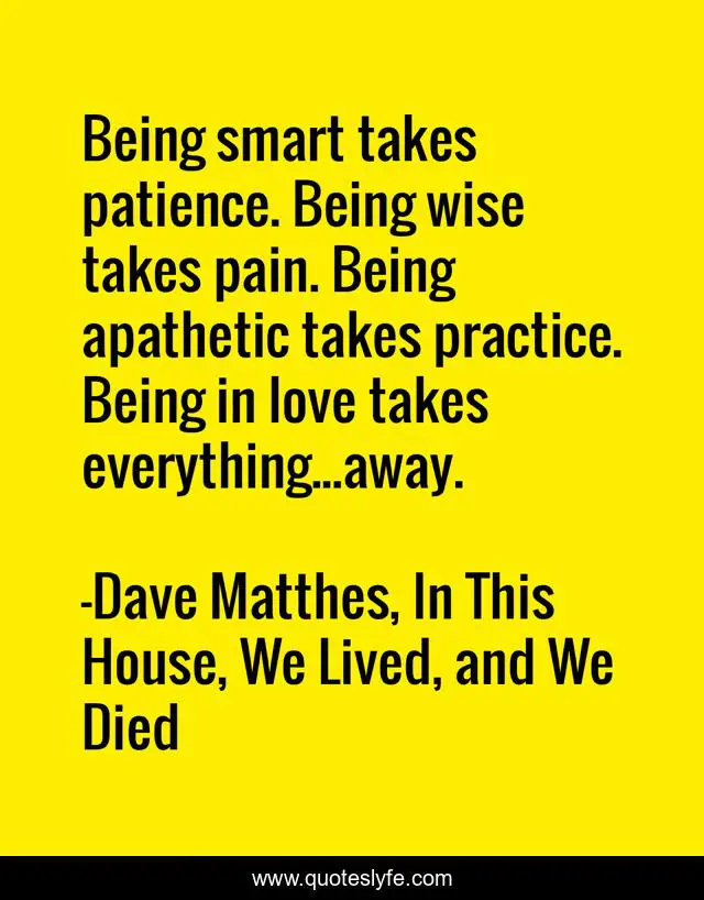 "Dave Matthes, In This House, We Lived, and We Died Quotes." Quoteslyfe.com, 2025. Sat. 06 Dec. 2025. <https://www.quoteslyfe.com/quote/Being-smart-takes-patience-Being-wise-takes-198521>.