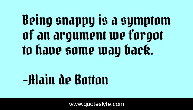 This page presents the quote "Being snappy is a symptom of an argument we forgot to have some way back.". Author of this quote is Alain de Botton. This quote is about anger, snappiness, arguments,.