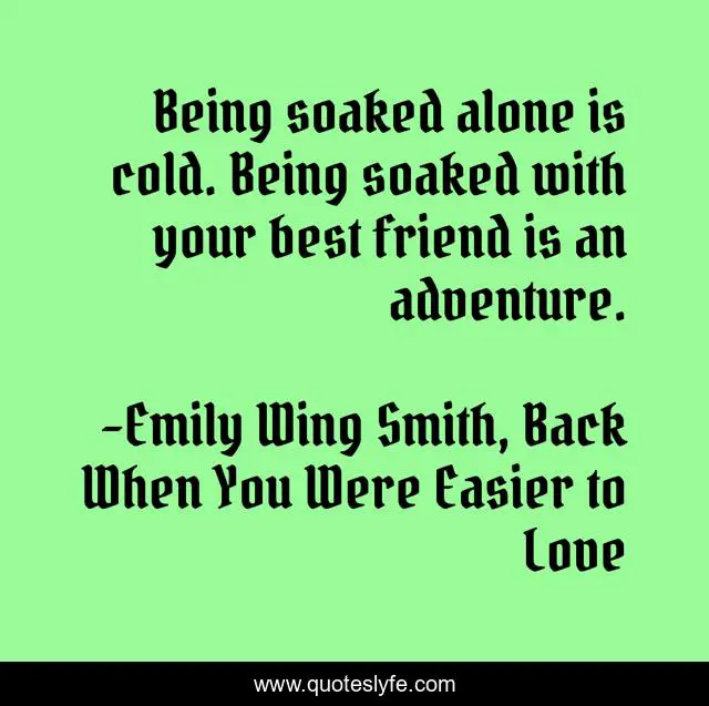 "Emily Wing Smith, Back When You Were Easier to Love Quotes." Quoteslyfe.com, 2025. Sat. 06 Dec. 2025. <https://www.quoteslyfe.com/quote/Being-soaked-alone-is-cold-Being-soaked-151436>.