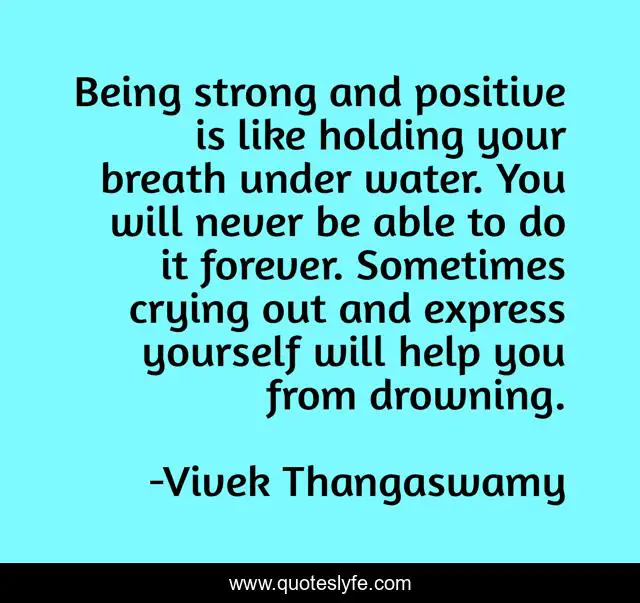 This page presents the quote "Being strong and positive is like holding your breath under water. You will never be able to do it forever. Sometimes crying out and express yourself will help you from drowning.". Author of this quote is Vivek Thangaswamy. This quote is about positive, life, strong, confidence, hope,.