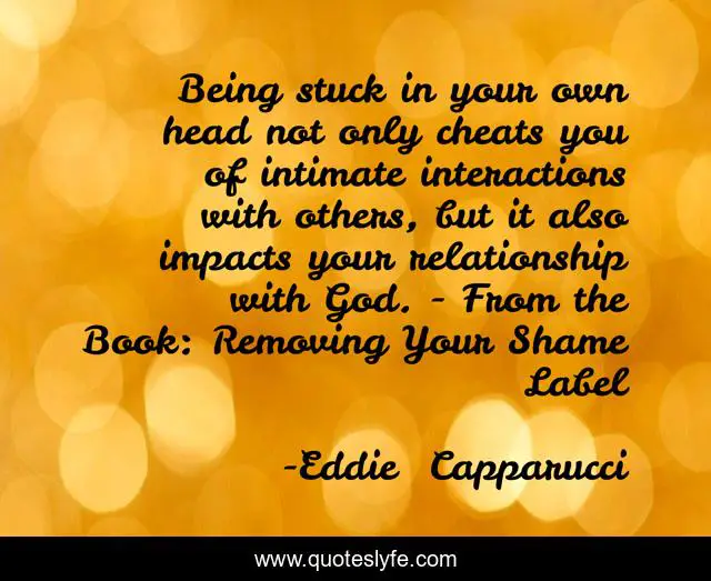 This page presents the quote "Being stuck in your own head not only cheats you of intimate interactions with others, but it also impacts your relationship with God. - From the Book: Removing Your Shame Label". Author of this quote is Eddie Capparucci. This quote is about shame, god-s-love-for-us, god-s-love, christianity,.