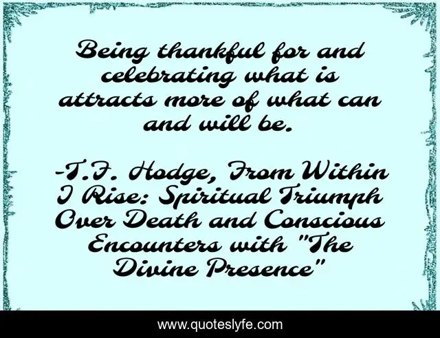 "T.F. Hodge, From Within I Rise: Spiritual Triumph Over Death and Conscious Encounters with "The Divine Presence" Quotes." Quoteslyfe.com, 2025. Tue. 09 Dec. 2025. <https://www.quoteslyfe.com/quote/Being-thankful-for-and-celebrating-what-is-243031>.
