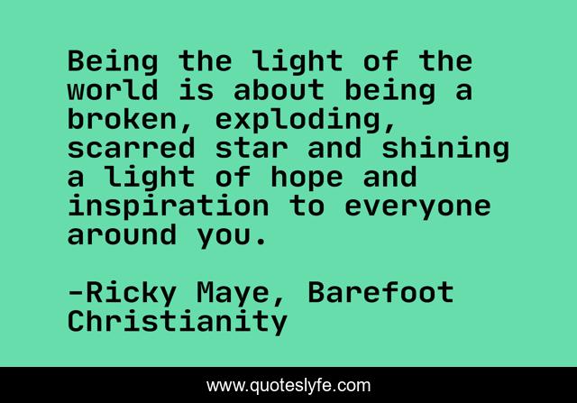 This page presents the quote "Being the light of the world is about being a broken, exploding, scarred star and shining a light of hope and inspiration to everyone around you.". Author of this quote is Ricky Maye, Barefoot Christianity. This quote is about faith, spiritual, scarred, christian, light, scars, pastor, jesus, quotes,.