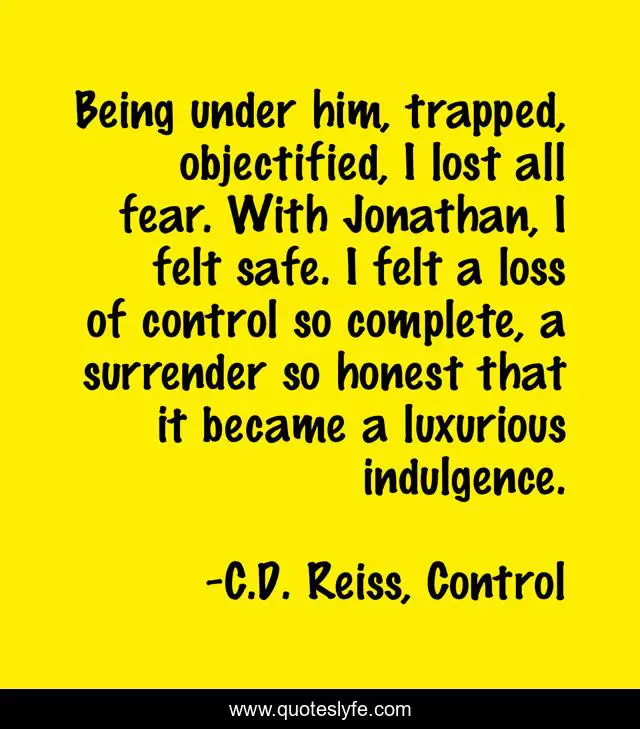 This page presents the quote "Being under him, trapped, objectified, I lost all fear. With Jonathan, I felt safe. I felt a loss of control so complete, a surrender so honest that it became a luxurious indulgence.". Author of this quote is C.D. Reiss, Control. This quote is about c-d-reiss, monica, drazen, submission, songs-of-submission, erotica, jonathan,.