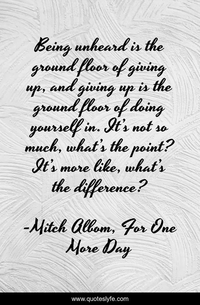 This page presents the quote "Being unheard is the ground floor of giving up, and giving up is the ground floor of doing yourself in. It’s not so much, what’s the point? It’s more like, what’s the difference?". Author of this quote is Mitch Albom, For One More Day. This quote is about loss, life, death, point, ground-floor, bottom, unheard, suicide, purpose,.